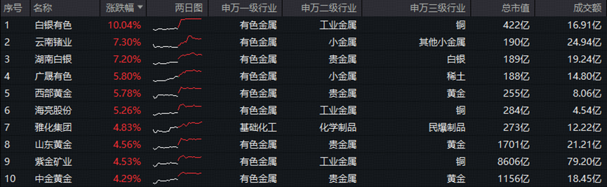细分方向来看,铜业龙头白银有色涨停,小金属龙头云南锗业、白银龙头湖南白银纷纷涨逾7%,稀土龙头广晟有色、黄金龙头西部黄金等个股跟涨。权重股方面,紫金矿业、山东黄金涨超4%