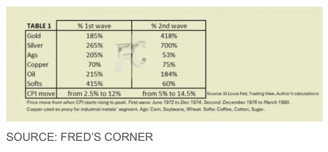 他展示了一张表格,列出1970年代第一波和第二波通胀期间各种大宗商品的表现。