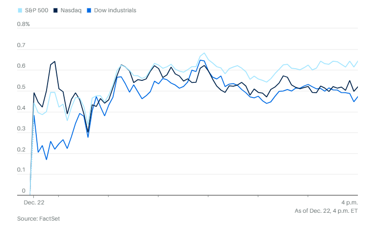 在这个因假期缩短的交易周,美股全面上涨。标准普尔500指数上涨0.6%,收盘逼近12月11日创下的6901点收盘高位。道琼斯工业指数上涨228点,涨幅0.5%。纳斯达克综合指数上涨0.5%。金价和银价也继续上涨并创下新高。