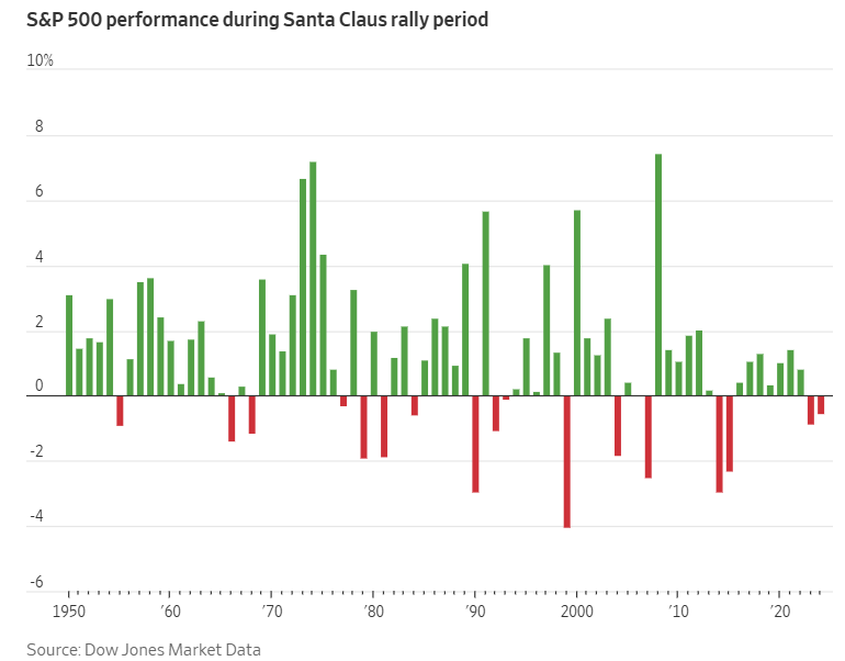 股市将在周二正常交易,周三则为缩短交易日,随后将因周四圣诞节休市。“圣诞行情”期间将于周三开启,该时段历史上往往表现强劲,涵盖一年最后五个交易日和新年最初两个交易日。