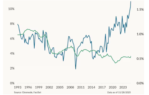 分析方面,据Glenmede首席投资策略与研究负责人贾森·普赖德和投资策略副总裁迈克尔·雷诺兹表示,按市值排名的七大公司当前的资本支出规模,已超过历史上任何一个七大公司组合。