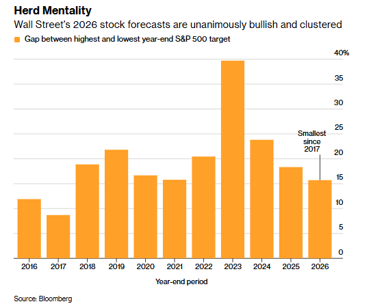 这种一致看法往往被视为一种逆向信号——当市场观点趋于一致时,往往会出现修正。同时,当前市场风险依然可见,尽管如此,多数策略师仍预计2026年股市将继续上涨,尽管过去三年已连续录得双位数涨幅。