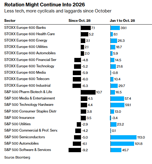 过去两个月,随着AI和半导体交易放缓,投资者开始重新配置仓位,寻找其他更具吸引力的领域。美欧市场均出现类似趋势,尽管细节不同。这种轮动有助于市场上涨更为广泛,投资者正将目光投向更具经济关联性、防御性或此前表现落后的板块。