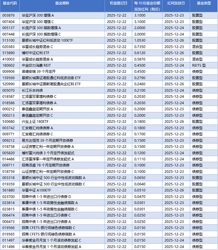 (1)12月22日新发基金共有21只,主要为债券型基金和股票型基金,其中华夏中证全指食品ETF募集目标金额达80.00亿元;基金分红38只,多为债券型,派发红利最多的基金是华宝沪深300指数增强型发起式证券投资基金,每10份基金份额派发红利3.1000元。
