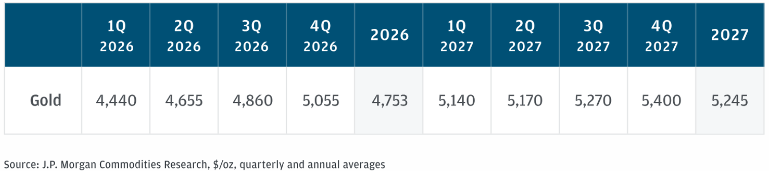 摩根大通全球研究预测,到2026年第四季度,黄金平均价格将达到每盎司5055美元,并预计这种贵金属到2027年底将达到每盎司5400美元。