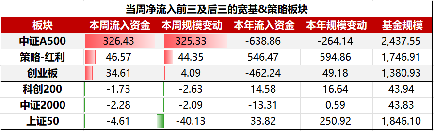 具体到细分板块,宽基&策略板块ETF中,净流入前三大板块依次为:中证A500、策略-红利、创业板;净流出前三大板块依次为:上证50、中证2000、科创200。