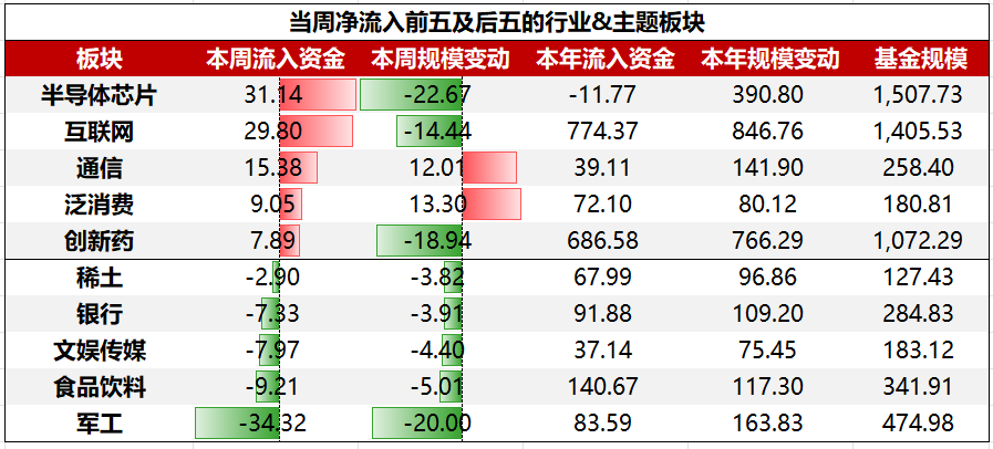 行业&主题板块ETF中,净流入前五大板块依次为:半导体芯片、互联网、通信、泛消费、创新药;净流出前五大板块依次为:军工、食品饮料、文娱传媒、银行、稀土。