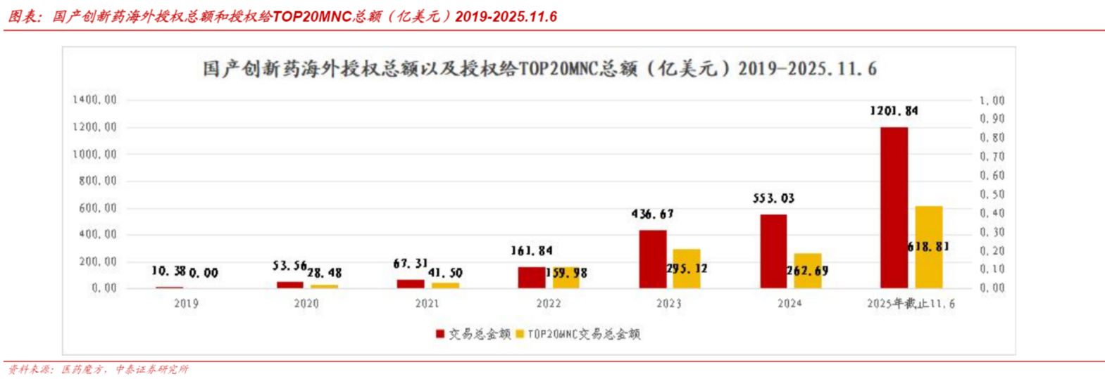 根据医药魔方数据,截至2025年11月6日,中国创新药License out年度总金额超过1200亿美元,远超2024全年出海总额(2024年License out总金额553亿美元)。其中,授权给TOP20 MNC的总金额达618.8亿美元。