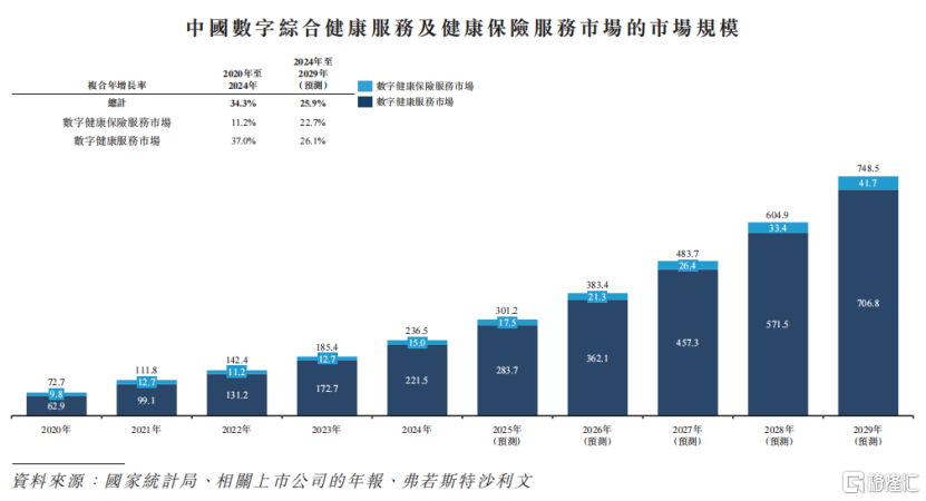 弗若斯特沙利文数据显示,我国数字健康销售的渗透率预计将由2024年的2.8%增至2029年的7.1%,数字健康保险销售渗透率则将由2024年的7.2%提升至2029年的12.9%;按收入计算,中国数字综合健康服务及健康保险服务的市场规模将由2024年的2365亿元增至2029年的7485亿元,年复合增长率高达25.9%。