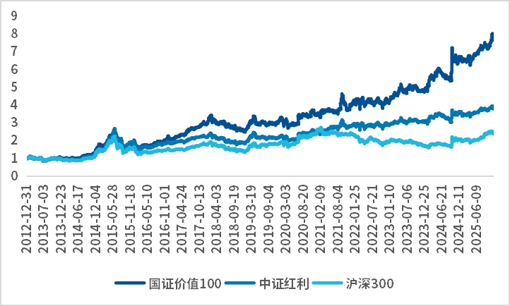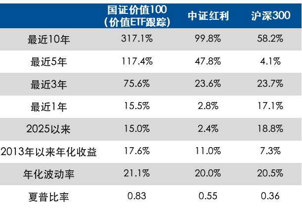 国证价值100的历史收益特征表现较好。2013年至今,国证价值100指数获得了17.3%的年化收益率,风险收益比0.81。同期中证红利指数年化收益率11.1%,风险收益比0.55,沪深300年化收益率7.4%,风险收益比0.36。