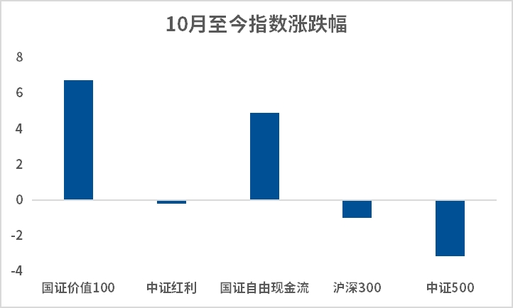 近期业绩表现印证了价值100作为“红利 ”的有效性。10月以来,A股市场整体价值风格占优,国证价值100、中证红利、国证自由现金流均作为价值风格标的,10月以来涨幅分别为:6.8%、-0.2%、4.9%,兼具红利属性与自由现金流属性的价值指数表现占优、更具表征性、也更稳定。