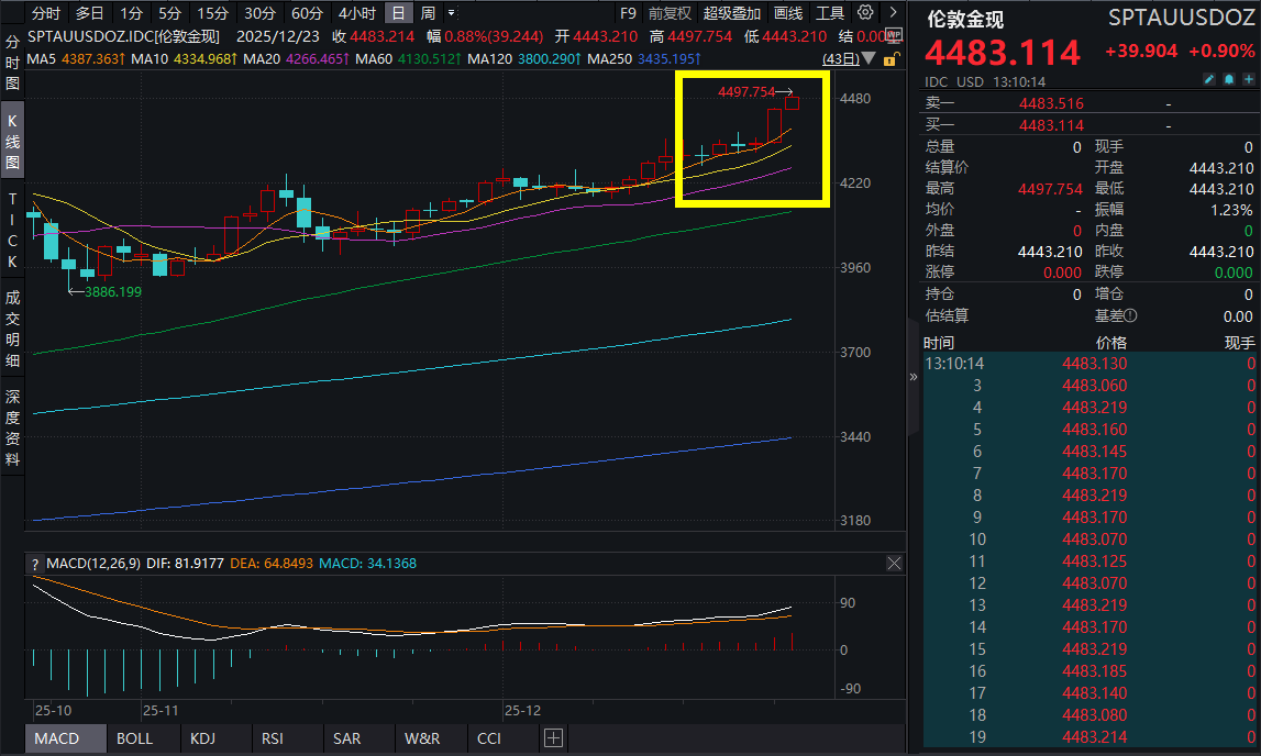 12月23日,现货黄金延续上涨势头,盘中一度逼近4500美元/盎司关口,达4497.754美元/盎司,续创历史新高,年内涨幅已超70%!COMEX黄金一度突破4530美元/盎司,同样创历史新高!