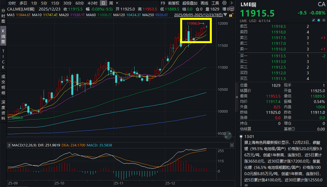 12月22日,伦敦金属交易所(LME)期铜创纪录新高,直逼12000美元!目前多家机构表示对2026年铜价看涨预估。花旗表示,由于铜运往美国市场的竞争加剧,价格可能在第二季度达到每吨13,000美元。高盛也表示,铜是其明年最看好的金属。
