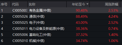 临近年末,金、铜、锂等有色金属细分板块冲高,为有色全年的亮眼行情再增添光彩! 今年以来,有色板块累计涨幅达90%,稳居30个中心一级行业榜首,夺冠在望!