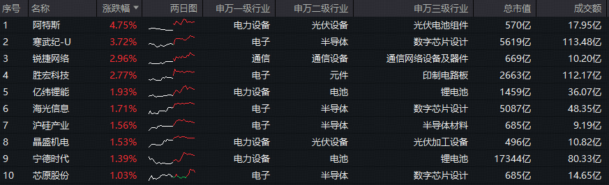 细分方向来看,光伏龙头方面,阿特斯涨超4%,晶盛机电涨逾1%;半导体龙头方面,寒武纪涨超3%,海光信息、沪硅产业涨逾1%;通信龙头方面,锐捷网络涨近3%,润泽科技飘红。