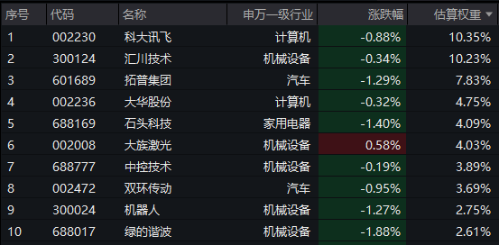 机器人ETF基金(159213)标的指数成分股多数回调,大族激光微涨0.58%,拓普集团、机器人等跌超1%,中控技术、双环传动等回调。