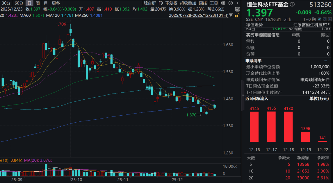 今日(12.23),港股科技两连阳后再度回调,100%纯度的港股通科技30ETF(520980)收跌1%,全天成交额2.59亿元!资金已连续7日净流入,近10日累计净流入超2.3亿元!