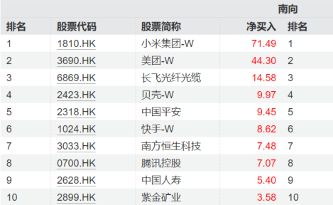 南向资金持续流入港股科技板块:近七日,小米集团-W累计获71.49亿港元的净买入,位居南向资金近7日净买入榜首!美团-W、快手-W、腾讯控股也均位居近7日南向资金净买入榜前十。