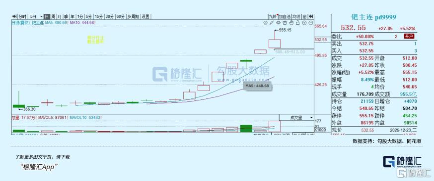 近期期货铂、钯涨势凌厉,12月以来持续爆发。广期所铂期货累计涨幅超40%,钯期货达43%在昨日双双涨停后,今日铂期货继续涨停,钯期货大涨5%