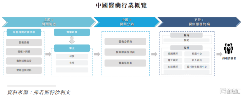 中国医药行业上游主要涉及原材料供应,以及医药的研究、开发及生产;原材料供应商主要提供必要的化学物质及中间体,药企通常负责医药研发、临床试验及产品制造,并通过与其他机构合作从事医药研发及临床测试。