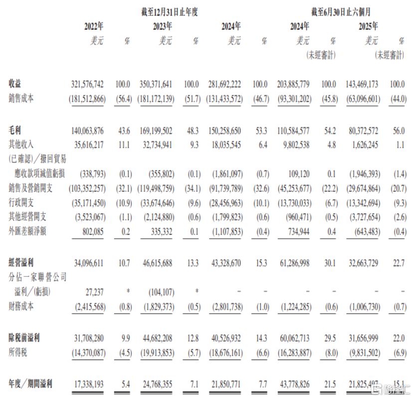 具体来看,2022年、2023年、2024年和2025年上半年,科郦的收入别约3.22亿美元、3.5亿美元、2.82亿美元、1.43亿美元,对应的净利润分别约1733.82万美元、2476.84万美元、2185.08万美元、2182.55万美元。