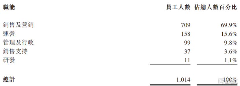 截至2025年12月10日,科郦共有1014名全职员工,其中销售人员最多,达到709人,运营、管理及行政、销售支持、研发分别为158人、99人、37人、11人。