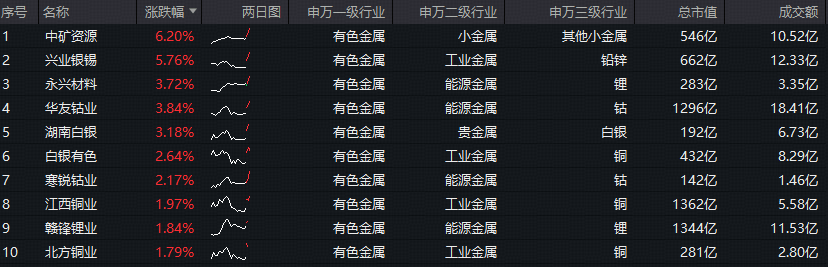 图:有色龙头ETF标的指数涨幅前10大成份股