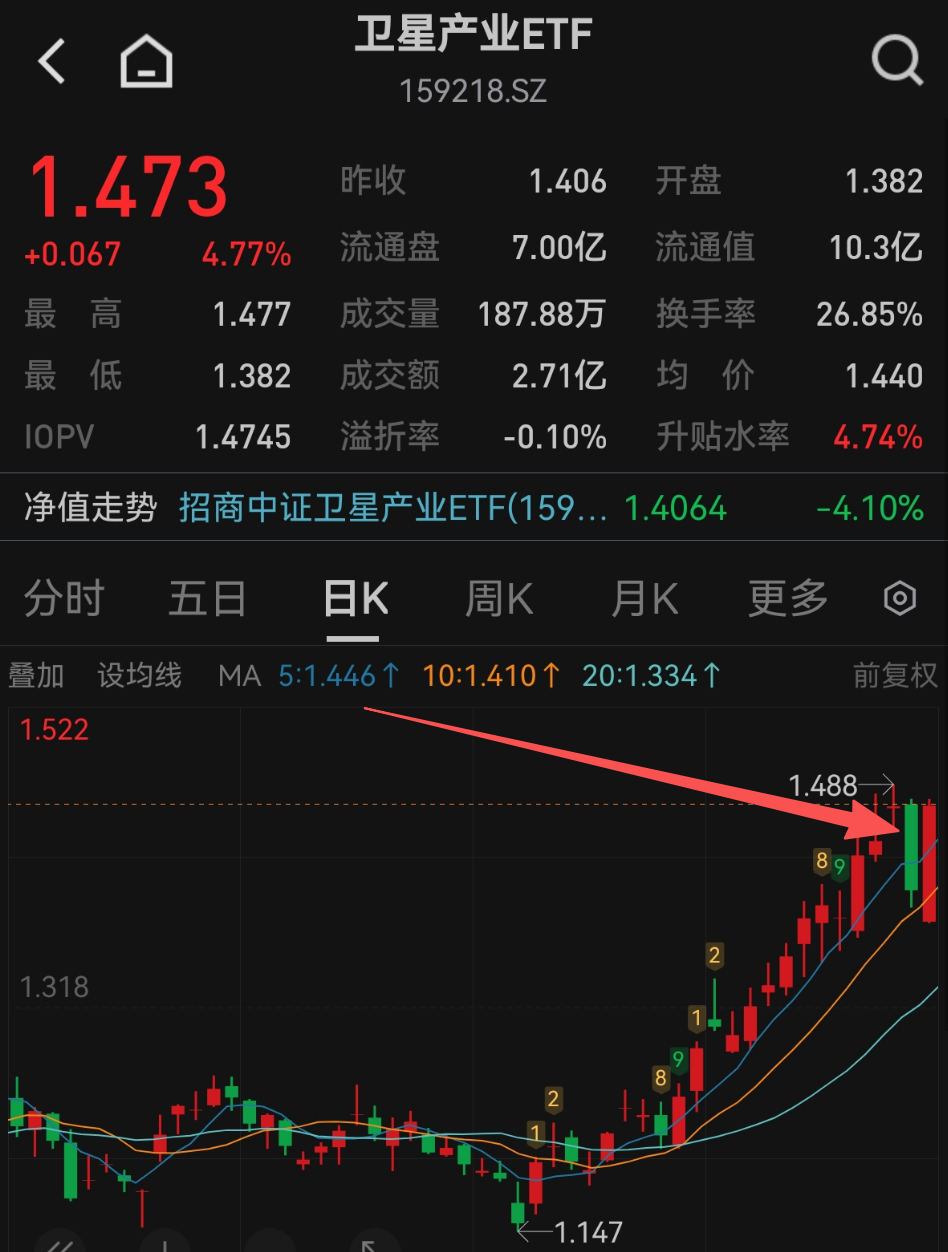 卫星产业ETF(159218)也是,明显的大阳线反包,昨日的回踩恰好跌过10日均线,今天随即拉出标志性大阳线,这往往是强趋势延续的中继信号。