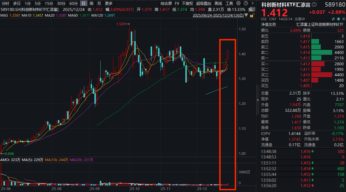 今日(12.24),硬科技概念再度飙升,科创新材料ETF汇添富(589180)放量涨近3%,强势冲击三连阳!