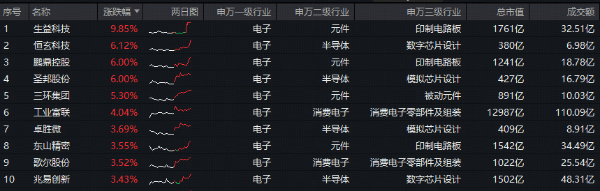 细分方向来看,PCB(印制电路板)方面,生益科技涨超9%,鹏鼎控股上涨6%,东山精密涨逾3%;半导体方面,恒玄科技涨逾6%,圣邦股份上涨6%,卓胜微涨超3%;消费电子方面,工业富联涨超4%,歌尔股份涨逾3%。