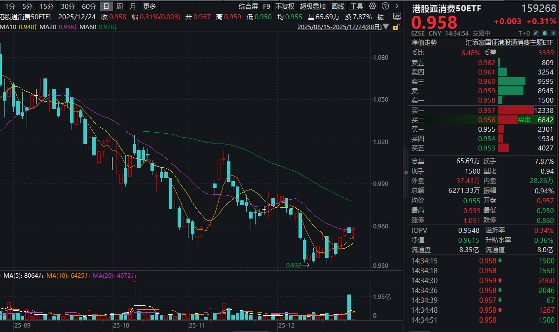 港股方面,港股通消费50ETF(159268)涨0.31%,盘中成交额超6300万元!港股新消费概念股过半飘红:农夫山泉涨超1%,百胜中国、万州国际、华润啤酒微涨;下跌方面,海尔智家跌超2%,安踏体育、泡泡玛特微跌(标的指数成分股仅做展示,不作为个股推介)。