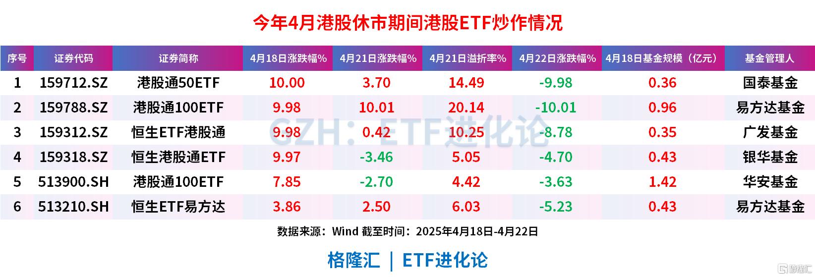 2025年4月因耶稣受难日与佛诞节,港股4月18日和4月21日休市,炒作行情更趋疯狂。易方达港股通100ETF连续两日涨停,溢价率突破20%,单日成交额从4560万元激增至2.01亿元,多只ETF换手率超400%,最高达977%。即便基金公司密集发布风险提示,仍未能阻挡投机热情,直至港股复市后,高溢价ETF集体跳水,港股通50ETF、港股通100ETF跌停,上演“一日天堂一日地狱”的剧情。