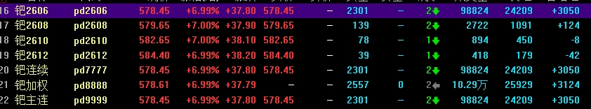 午后,钯金主力期货也牢牢封住涨停,报578.45元/克,大涨7%,截止收盘,钯金主力期货钯金2606以及2608、2610、2612合约也全部涨停。钯金期货上市20交易日从377元/克一路大涨至578.45元/克,上涨超过53%。