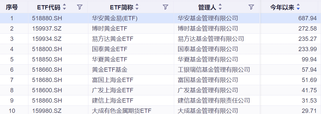 而商品类ETF的增速则依赖于黄金ETF的一路“狂奔”:在地缘局势、央行购金,美联储政策转向灯多重因素共振下,黄金ETF规模一路走高 。截至12月23日,中国市场14只黄金ETF总规模突破2400亿,较年初增长超70%,华安黄金易ETF今年以来净流入687.94亿,净流入居首;博时黄金ETF、易方达黄金ETF、国泰黄金ETF年内规模增长均超200亿。
