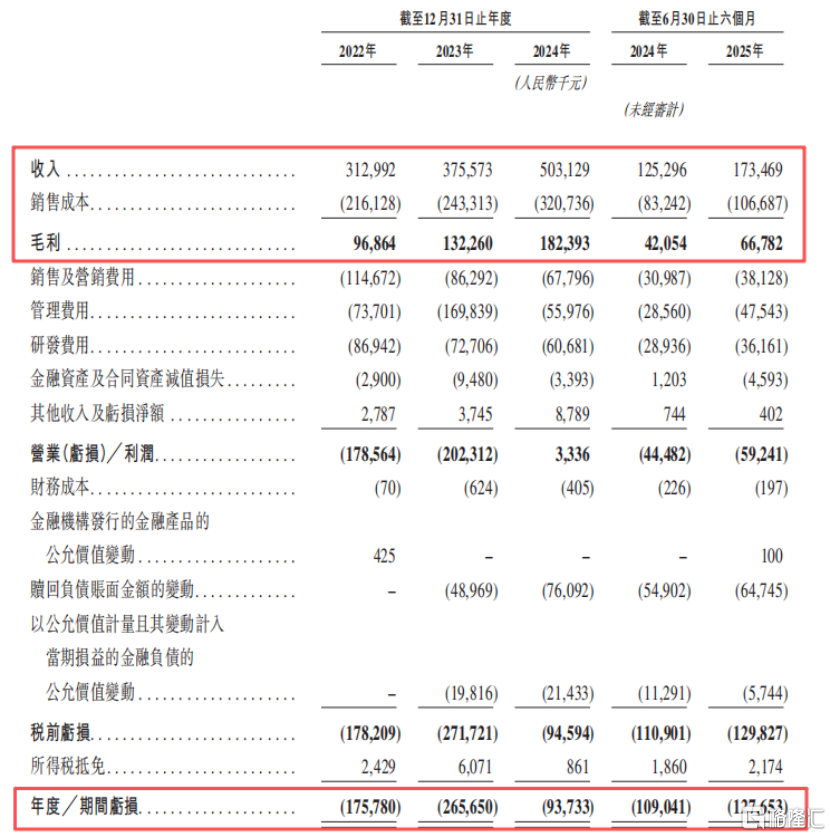 2022年、2023年、2024年及2025年1-6月(报告期),公司的收入分别为3.13亿元、3.76亿元、5.03亿元、1.73亿元,2022年至2024年的复合年增长率为26.8%。