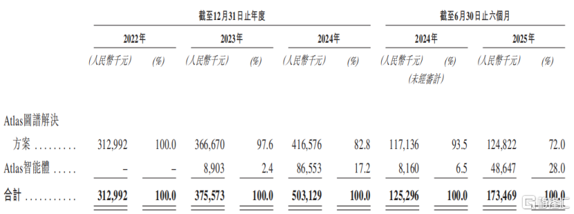 分业务线来看,2022年至2025年上半年,海致科技来自Atlas图谱解决方案的收入占比由100%下降至72%,而来自Atlas智能体的收入由0提升至28%。