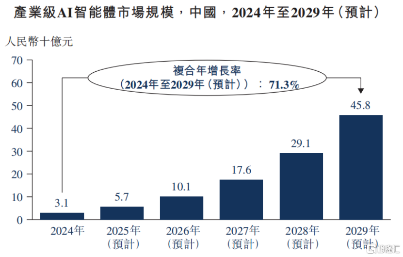 招股书中预计,集成知识图谱的产业级AI智能体的市场规模自预计将由2024年的2亿元快速增至2029年的132亿元,复合年增长率达140%。