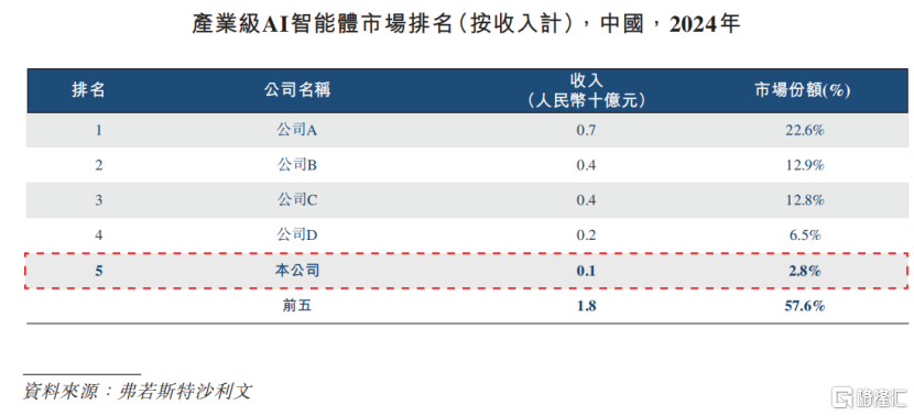 产业级AI智能体市场排名(按收入计),来源:招股书