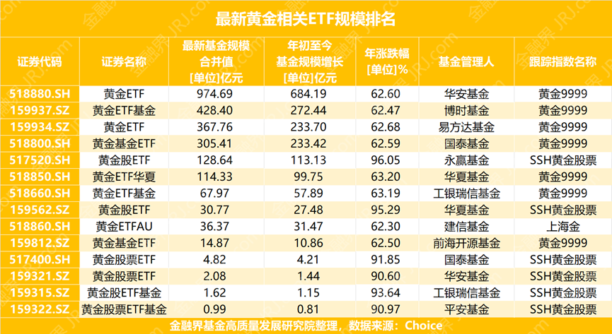 来自Choice金融终端的数据显示,截至12月23日,主流的黄金商品ETF年内集体上涨超过62%,而黄金股票ETF的涨幅更是集体超过90%。更引人注目的是规模的增长,所有黄金相关ETF的合并规模从年初水平增长了1771亿元,最新总规模已达到2478亿元。其中,规模超过百亿元的ETF产品有六只,包括华安黄金ETF、博时黄金ETF基金、易方达黄金ETF等,规模最大的华安黄金ETF已逼近千亿关口。