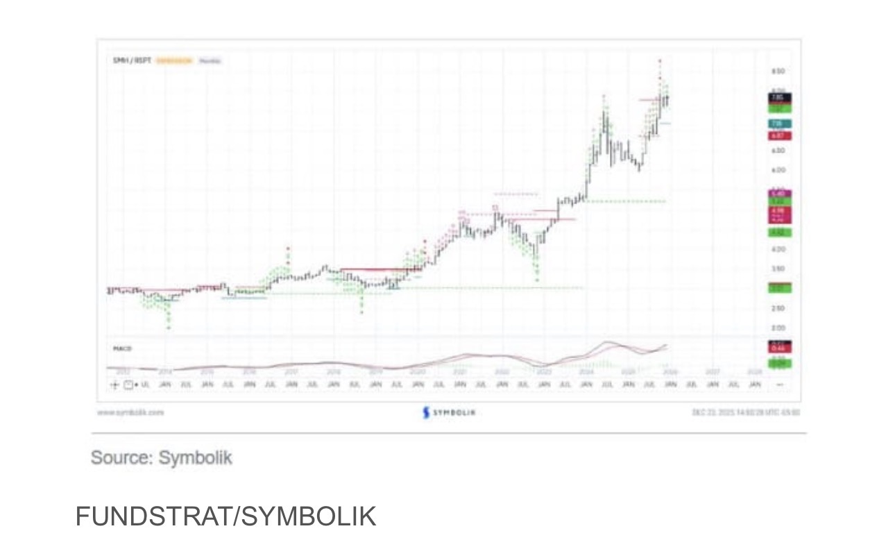“总体来看,这张月度走势图表仍坚定支持持有半导体股票至2026年。如果我的判断正确,随着英伟达本周的反弹,半导体板块将实现相对突破,并在接下来的一年多时间里跑赢科技的硬件和软件板块。”他说。(市场观察)