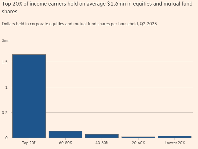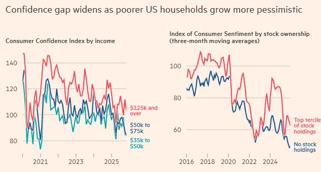 密歇根大学消费者信心指数显示,拥有投资组合的人对经济的感受明显优于不持股者,后者的信心已降至自1998年学校开始收集项数据以来的最低点。