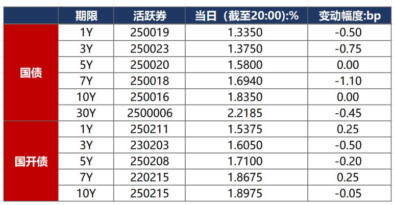 12月24日,受央行降准、买债等多个传闻影响,债市整体震荡盘整。截至北京时间20:00,10年期国债活跃券250016收益率持平于1.8350%,10年期国开债活跃券250215收益率下行0.05bp至1.8975%