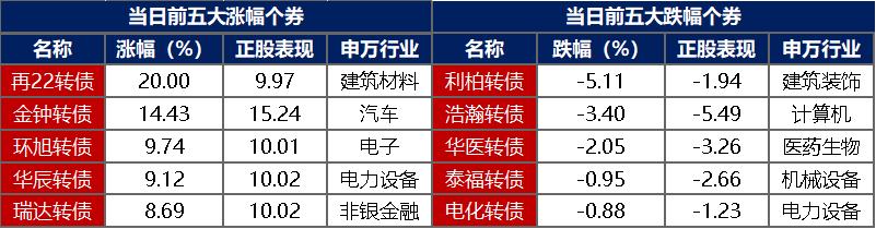 【转债市场主要指数集体跟涨】 12月24日,转债市场跟随权益市场有所上扬,当日中证转债、上证转债、深证转债分别收涨0.71%、0.75%、0.62%。当日,转债市场成交额758.99亿元,较前一交易日放量45.67亿元。转债市场个券多数上涨,392支转债中,315支收涨,58支下跌,19支持平。当日上涨个券中,再22转债涨停20%,金钟转债涨超14%;下跌个券中,利柏转债跌逾5%,浩瀚转债跌逾3%。