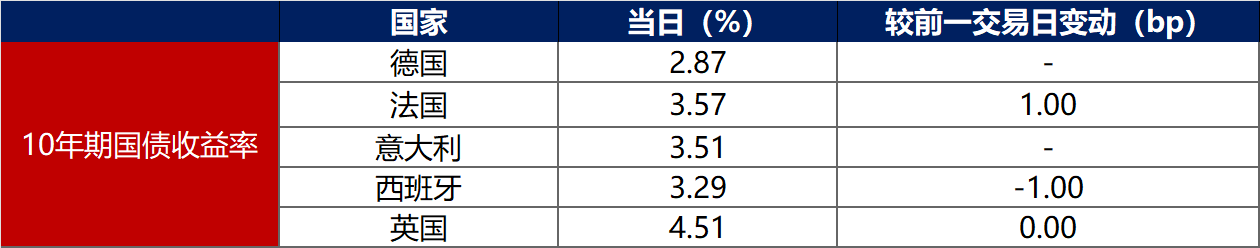 12月24日,主要欧洲经济体10年期国债收益率走势分化。其中,德国、意大利债市因圣诞前夜休市一日,法国10年期国债收益率上行1bp,西班牙10年期国债收益率下行1bp,英国10年期国债收益率保持不变。
