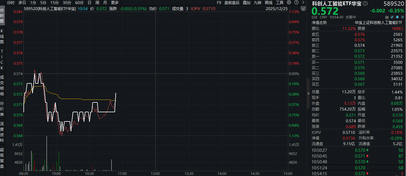 12月25日早盘,市场盘整,重点布局国产AI产业链的科创人工智能ETF(589520)随市回调,场内价格现跌0.35%,值得关注的是,该ETF场内溢价频现,显示买盘资金更为强势,或有资金逢跌进场布局!