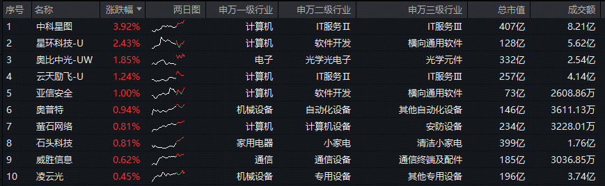 成份股方面,中科星图领涨超3%,星环科技涨逾2%,奥比中光、云天励飞、亚信安全等个股跟涨。另一方面,芯原股份跌近6%,道通科技、海天瑞声跌逾1%,跌幅居前,拖累指数表现。