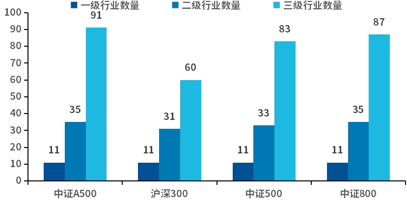 2025年6月的调整在上述基础上进行了“结构微调与再平衡”。增配工业、可选消费、房地产行业可以更好反映经济企稳复苏的趋势,同时对信息技术、通信服务、医药卫生、原材料等行业内部进行更新,新纳入成份股如沃尔核材、赛维时代等。第二次定期调整后,中证指数公司表明,A500指数对新兴行业的占比升高至约46.5%,对“新质生产力”的表征性进一步提升。至此,指数覆盖的二级、三级行业数量分别为35个和91个,远多于沪深300、中证2000等宽基指数,体现出了行业充分均衡的特点。