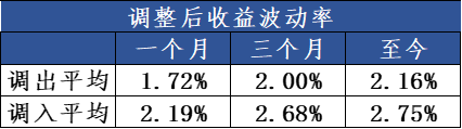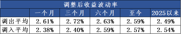 收益提升的同时,风险控制同样重要。观察调整后的波动率数据可以发现:在2024年12月调整后,调入组合在多数时间区间的收益波动率低于或接近调出组合。例如,一个月波动率调入组平均为2.38% ,调出组为2.61%,体现了“更高收益、相近或更低波动”的理想局面。