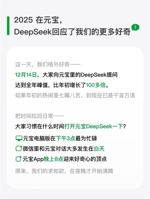 与此同时,腾讯的“快”还体现在将AI能力快速注入庞大产品生态的效率上。目前,腾讯已将微信、QQ、腾讯会议等超过900个产品接入AI。通过“双引擎”策略,其核心产品能迅速同时支持自研混元与第三方先进模型。这种快速融合产生了显著效果,据元宝发布的《元宝xDeepSeek年度报告》显示,元宝AI助手的日提问量在12月14日的提问量达到全年峰值,较年初增长超100倍。这让AI如同水和电一样,迅速渗透到亿万用户的生活中。