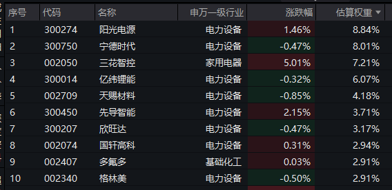电池50ETF(159796)标的指数成分股涨跌互现,三花智控大涨超5%,先导智能涨超2%,阳光电源等涨超1%,国轩高科、多氟多等跌超1%,宁德时代、亿纬锂能等回调。